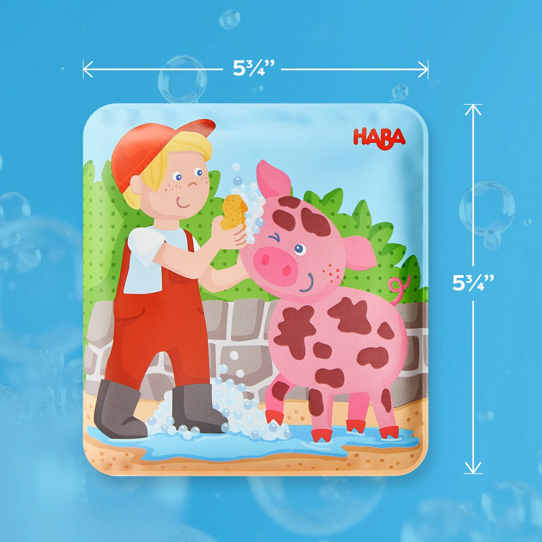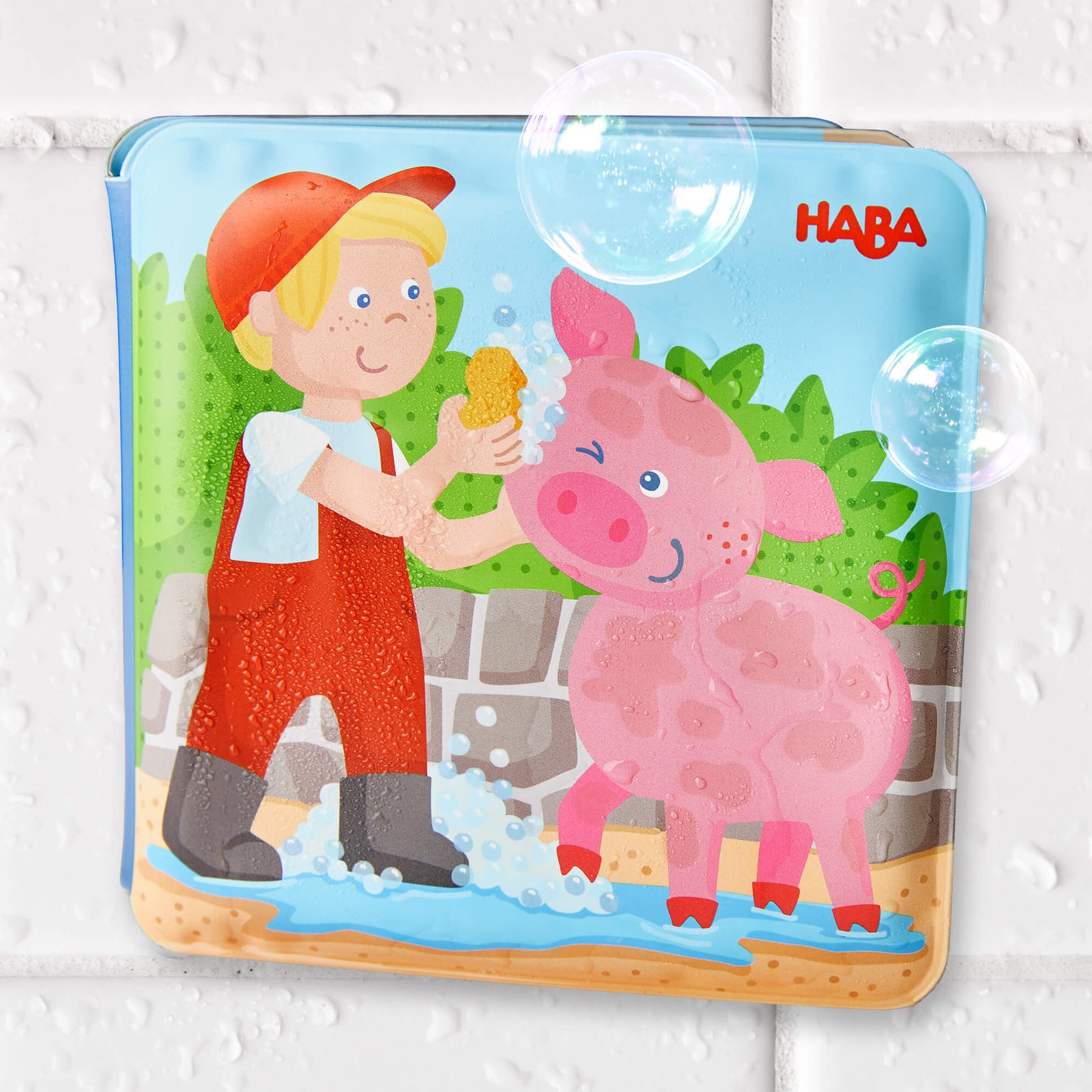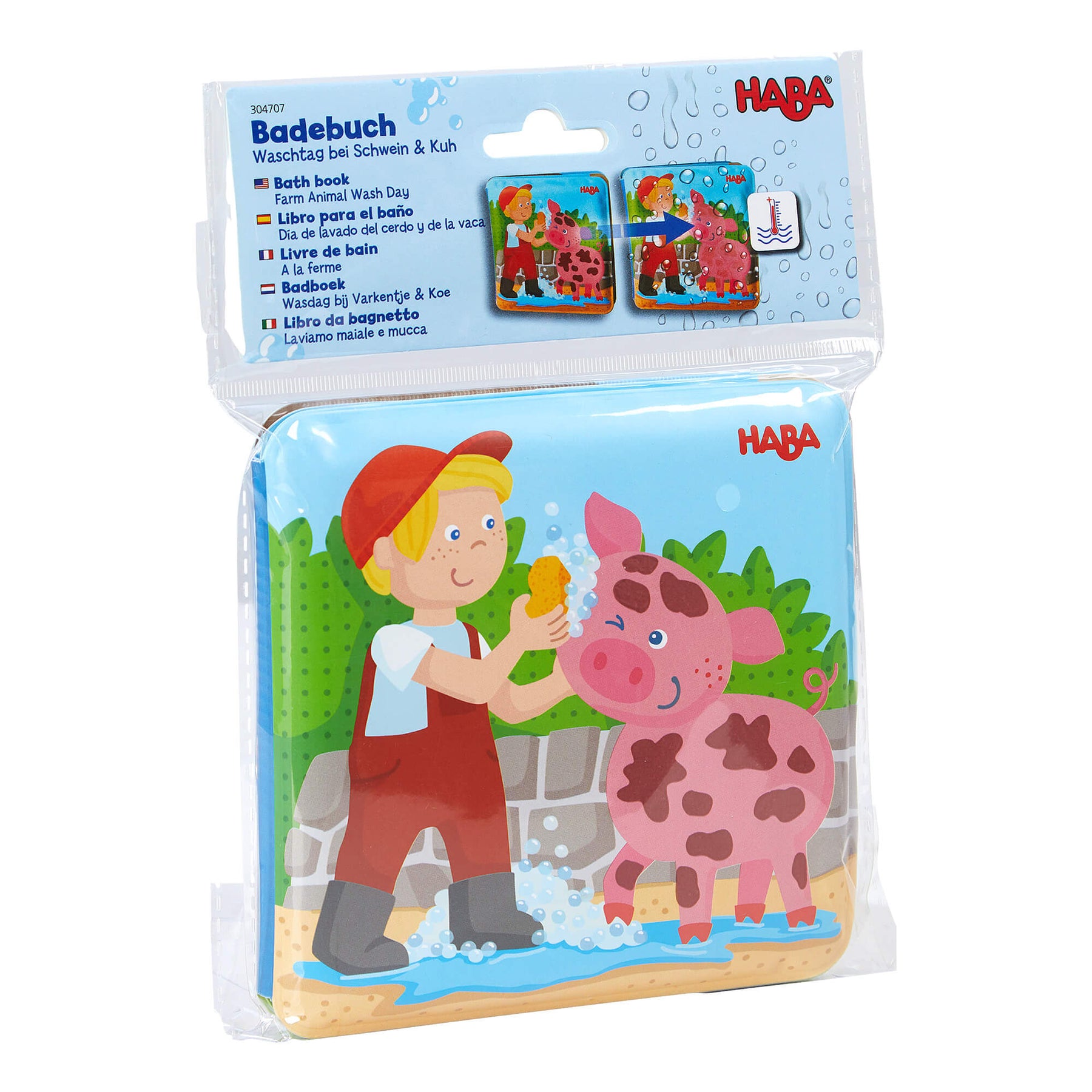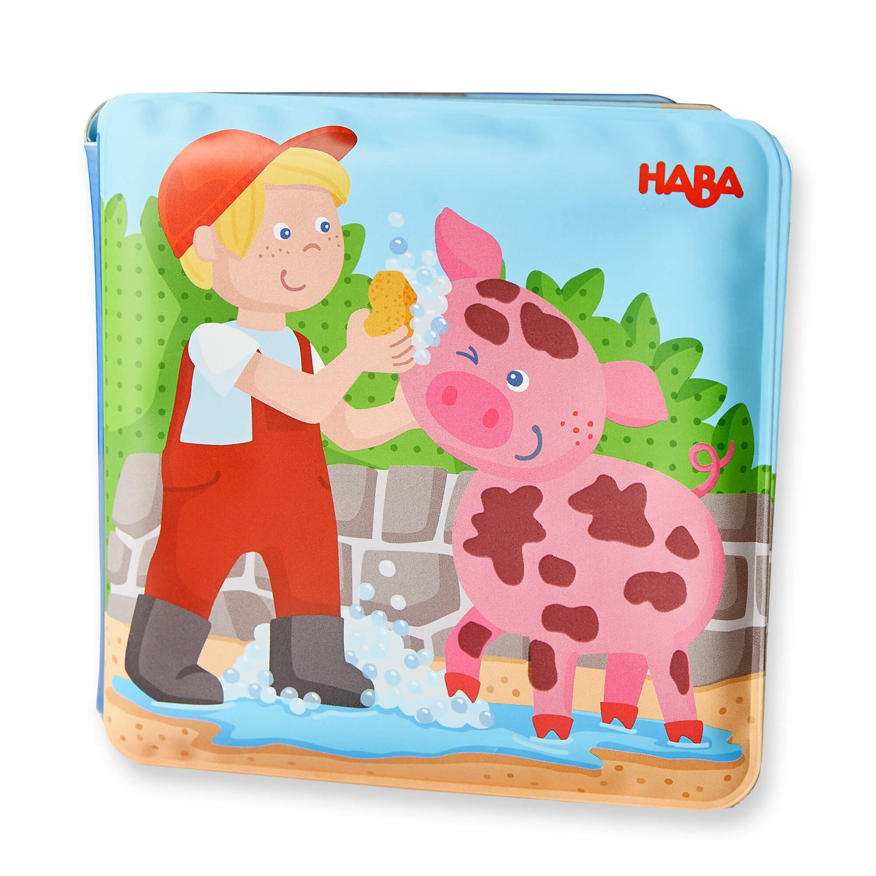 Farm Animal Magic Color Changing Wash Away Bath Book with a boy and pig illustration, featuring the HABA brand.
