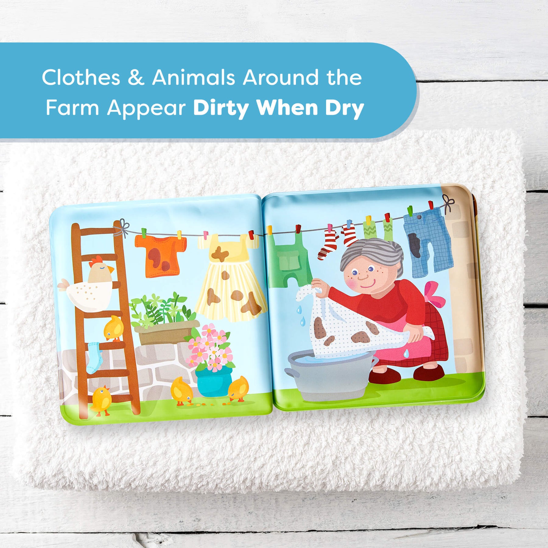 Farm Animal Magic Color Changing Wash Away Bath Book about farm animals and washing clothes, text reads "Clothes and animals around the farm appear dirty when dry."