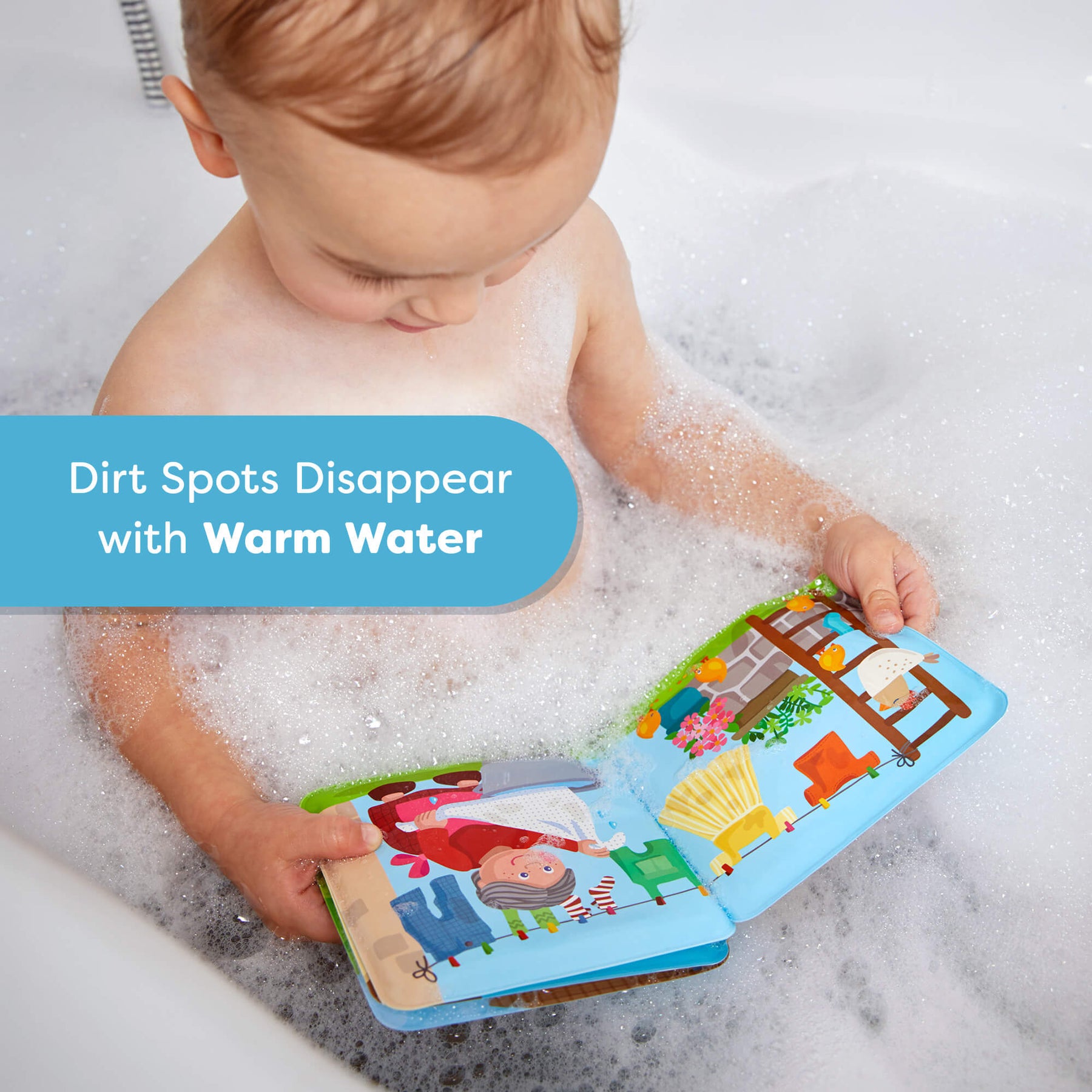 Child in a bath holding a Farm Animal Magic Color Changing Wash Away Bath Book with text &