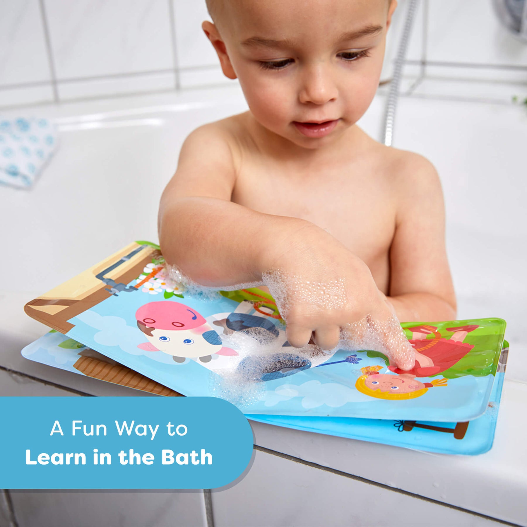 Child playing with a Farm Animal Magic Color Changing Wash Away Bath Book in the bathtub, text reads "A fun way to learn in the bath"
