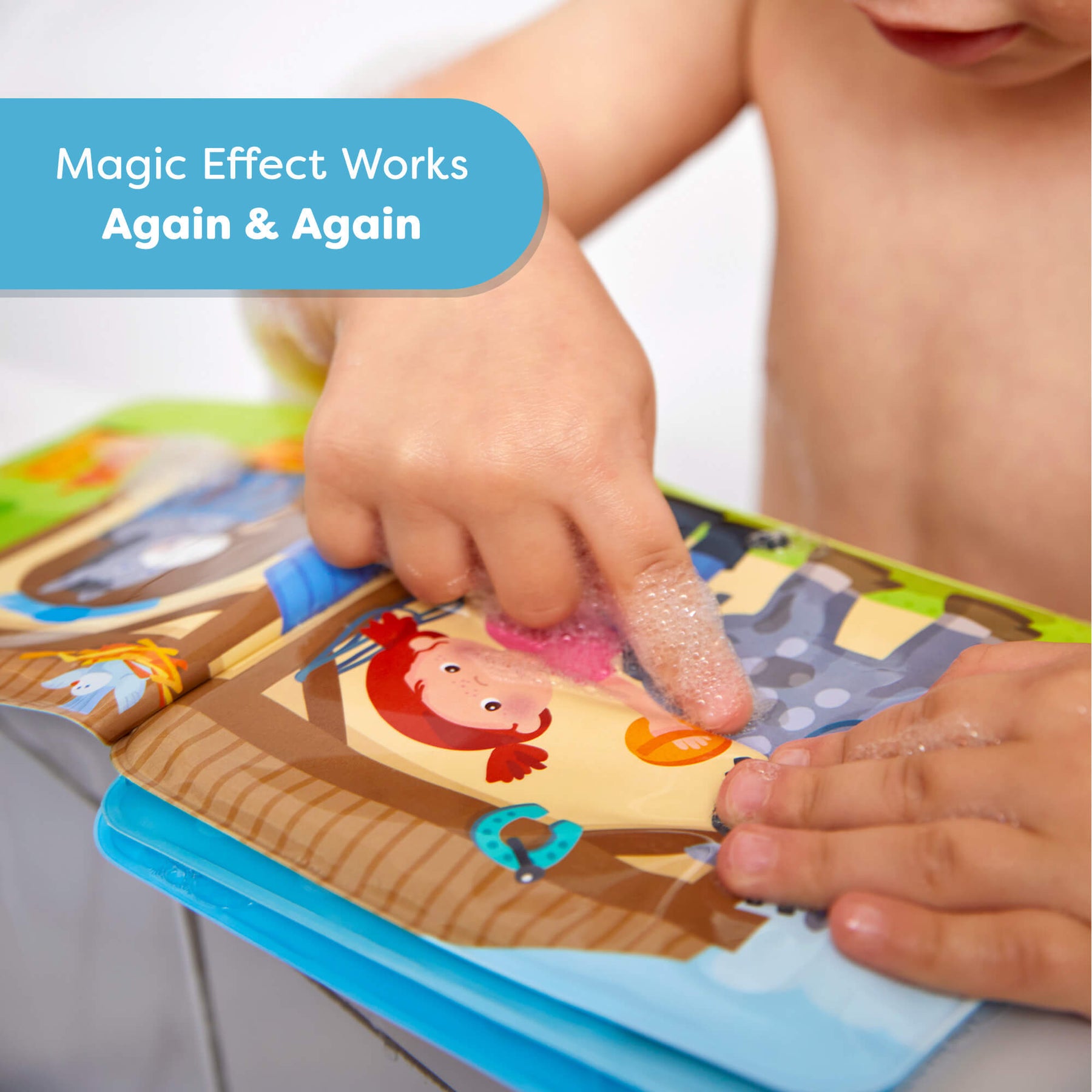 Child playing with a Farm Animal Magic Color Changing Wash Away Bath Book, with text &