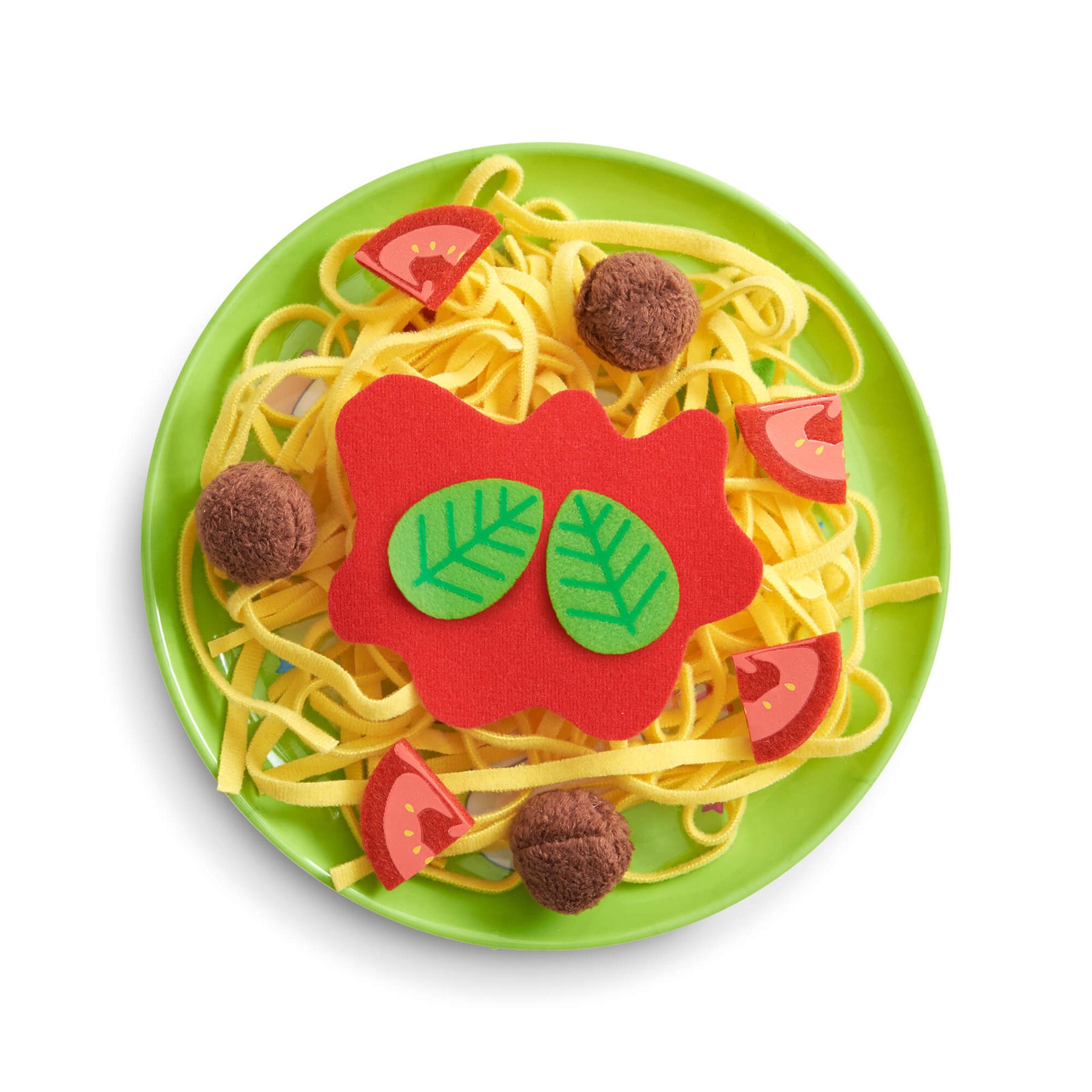 Includes: 1 plate, 3 meatballs, 1 serving of noodles, 4 tomato wedges, 2 basil leaves, 1 dollop of tomato sauce