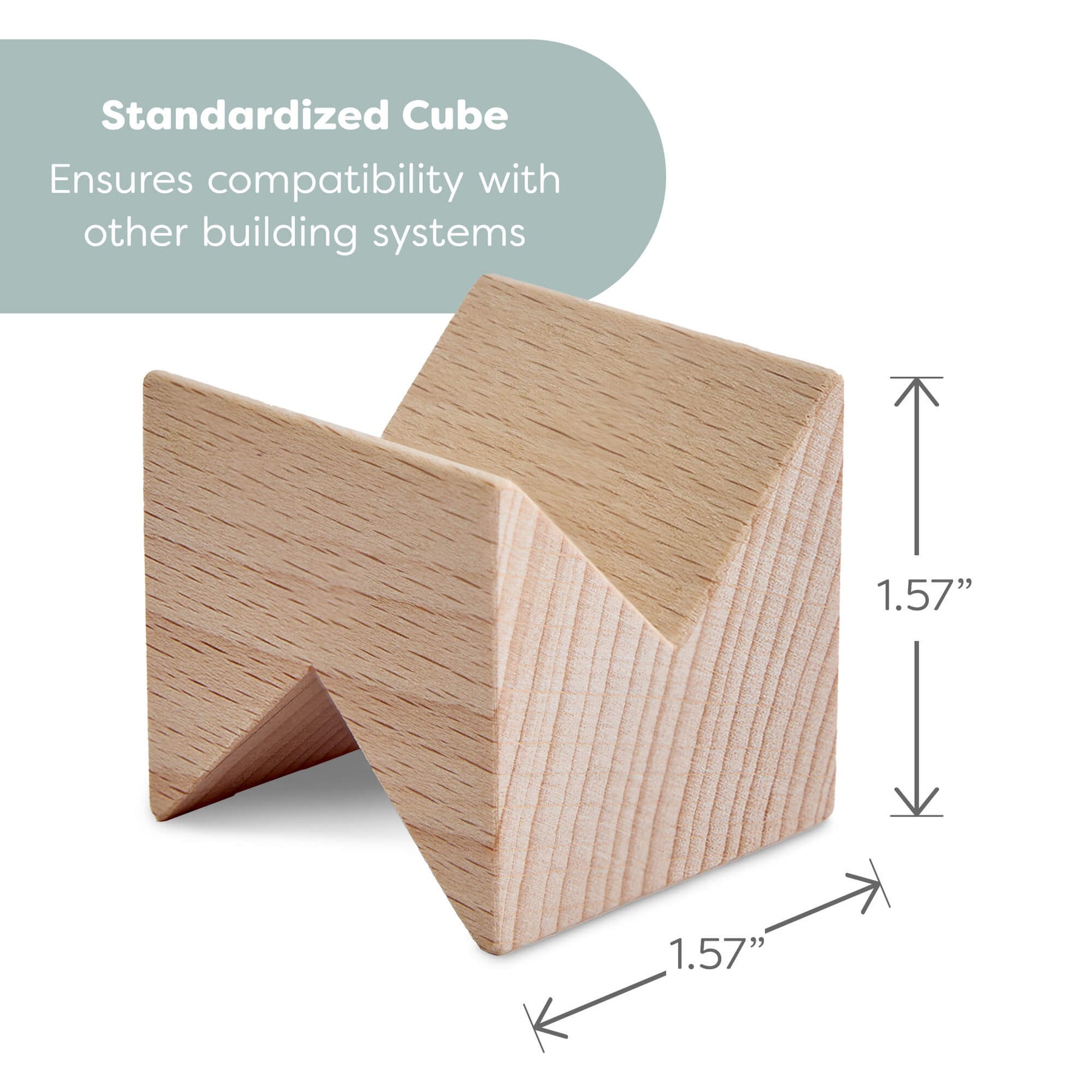 A wooden zigzag-shaped block measuring 1.57" x 1.57" inches in height and width. Text reads "Standardized Cube