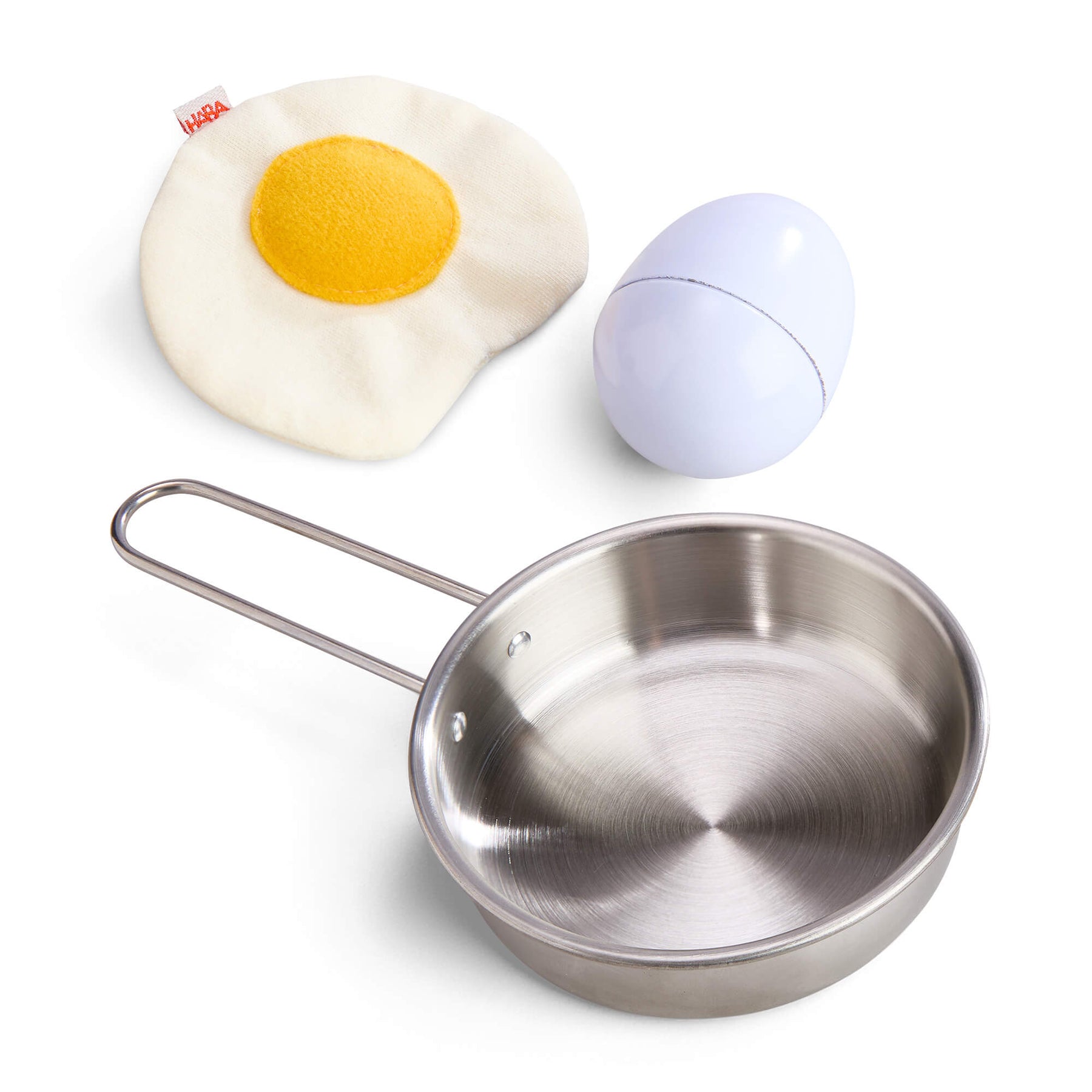 Creative Play – Fried Egg and Pan Play Food Set includes stainless steel frying pan with a fabric egg on a white background