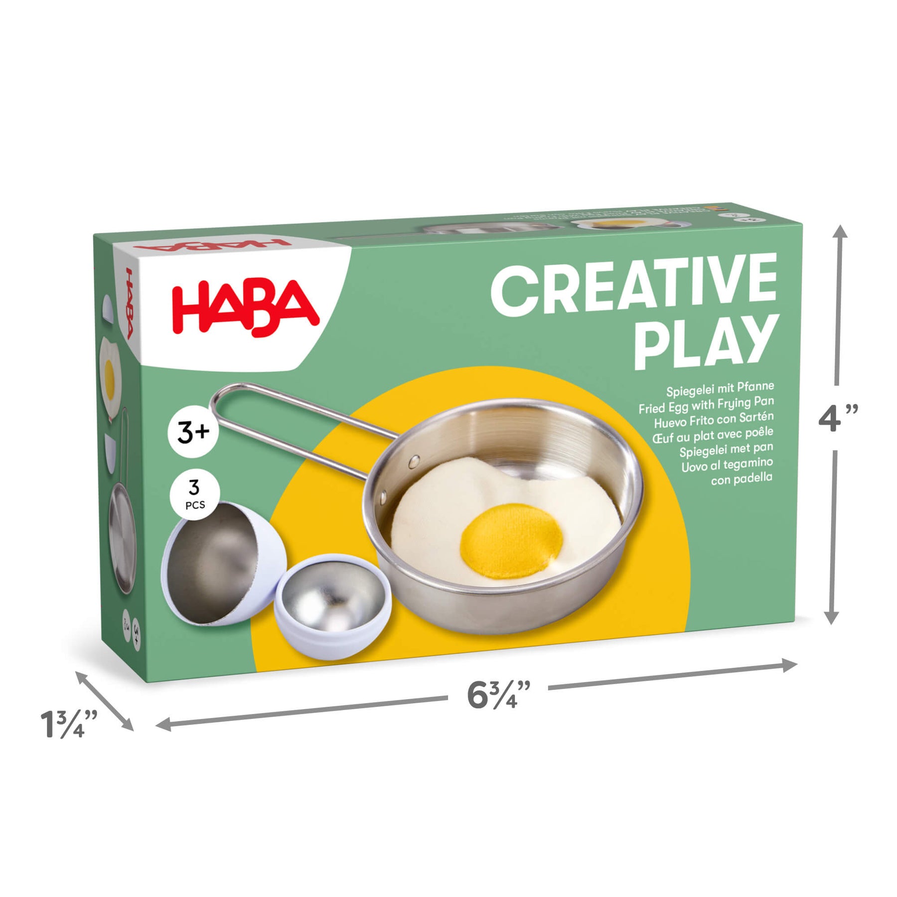 Creative Play – Fried Egg and Pan Play Food Set packaging with 4" tall, 6.75" wide and 1.75" deep dimensions on a white background