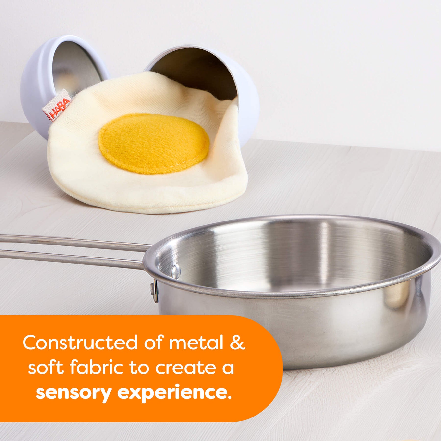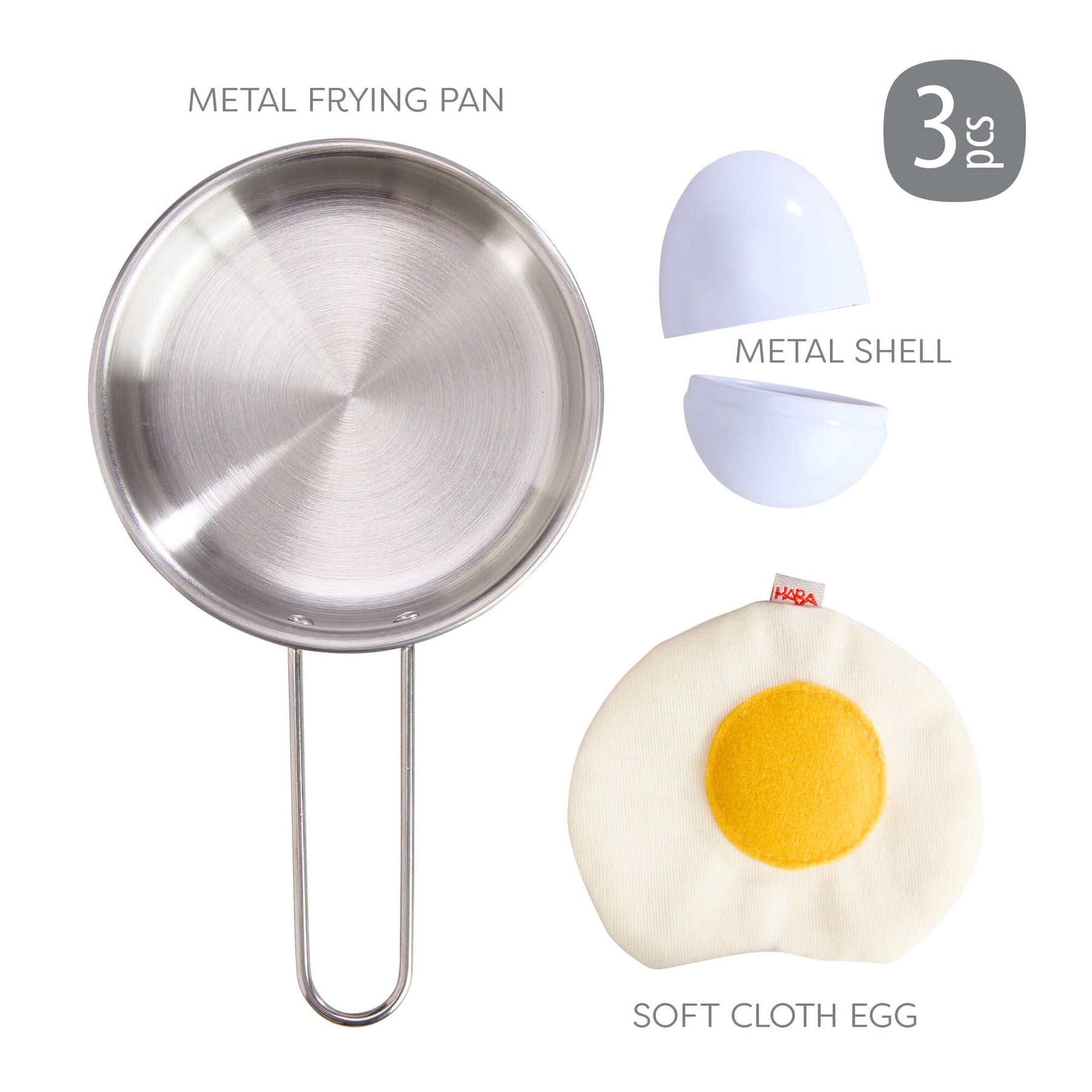 Creative Play – Fried Egg and Pan 3 piece Play Food Set induces 1 Metal frying pan, 1 metal shell and 1 soft cloth egg