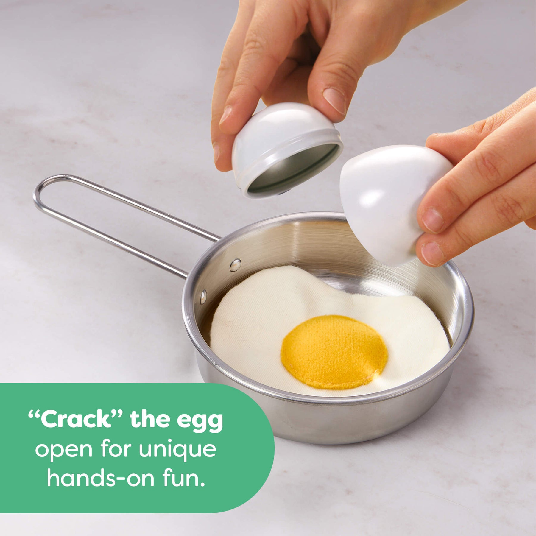 Hands opening up a Creative Play – Fried Egg and Pan Play Food Set metal egg with text reading &