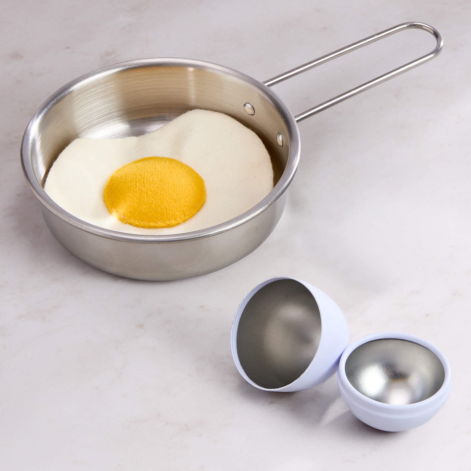 Creative Play – Fried Egg and Pan Play Food Set Metallic egg pan with eggs on a light surface