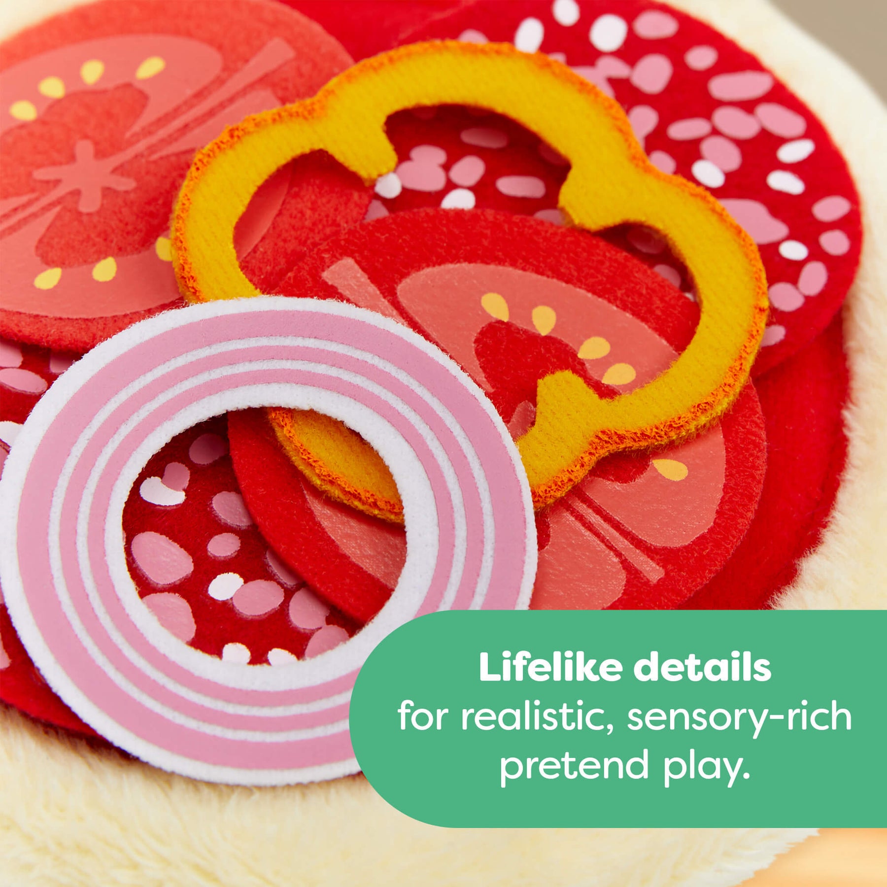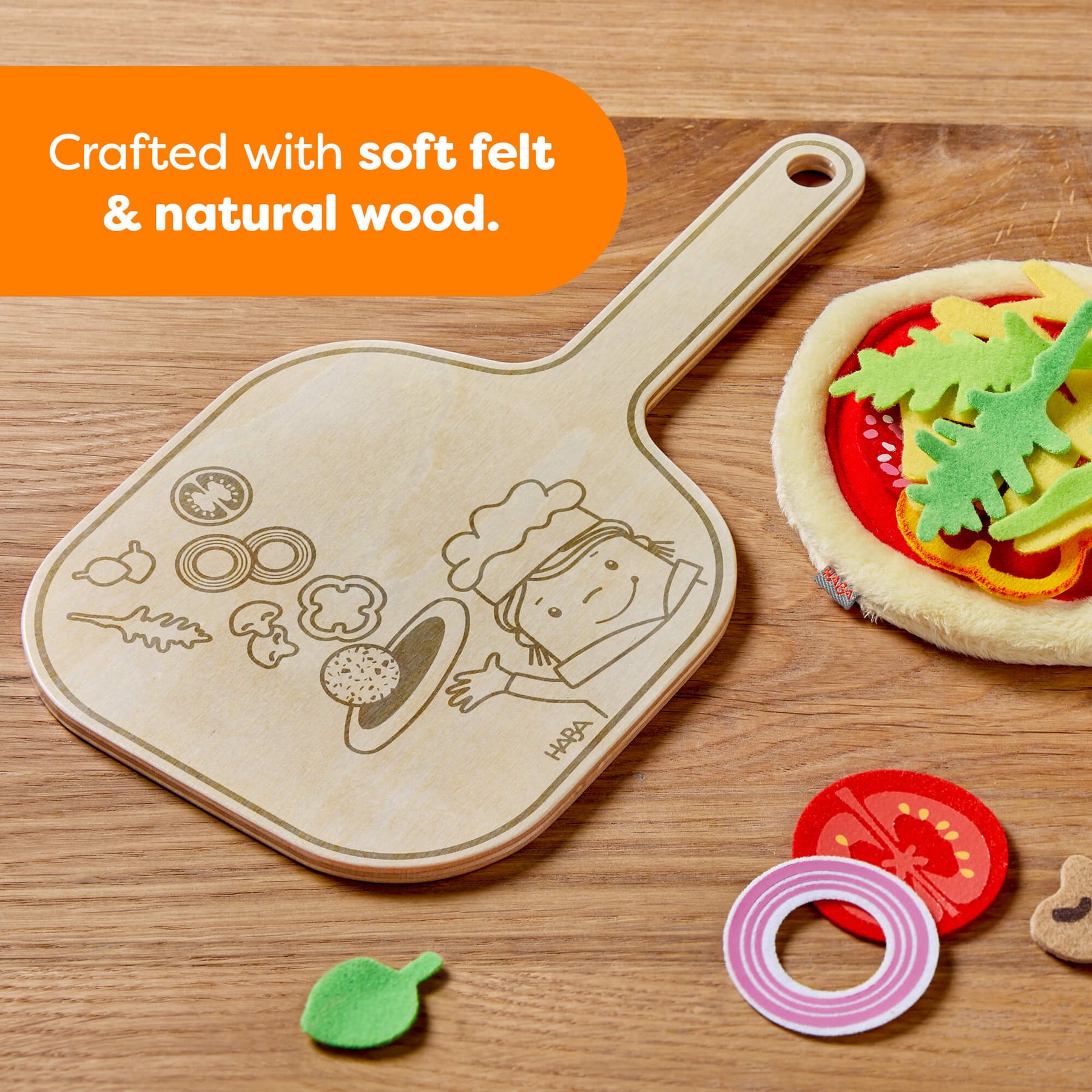 Slice, top, and serve with this deliciously fun play food set! Welcome to Ristorante HABA, where every child becomes a pizza chef! This adorable pizza set invites little ones to build their own culinary creations with soft, fabric pizza bases and a colorful variety of felt toppings. From mushrooms to basil leaves, even a wooden pizza peel, this set is lovingly crafted for hours of pretend kitchen fun.